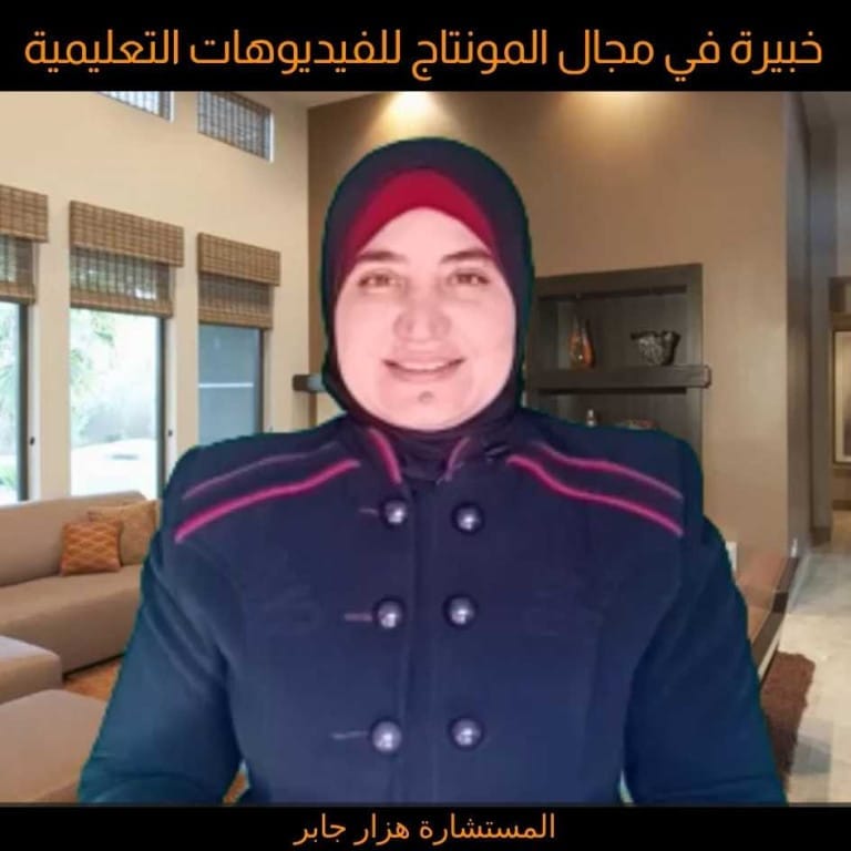 المستشارة هزار جابر خبيرة في مجال المونتاج للفيديوهات التعليمية في أسبوع الموناليزا وصناعه المؤثرات الصوتية والمرئية وتنسيق الخطوط وازاله المقاطع الغير مرغوب فيها وفصل الخلفيات واضافه خلفيات جذابه.
